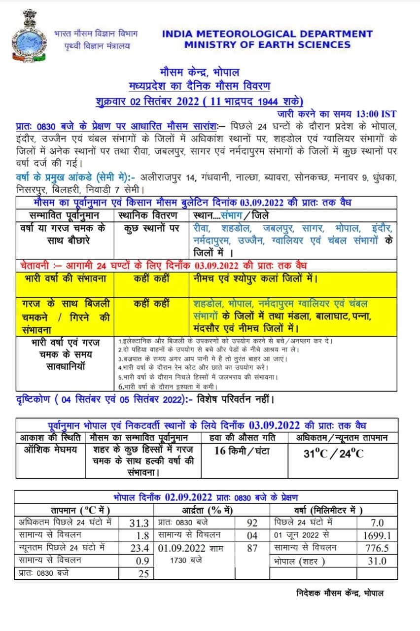 भोपाल, डेस्क रिपोर्ट। सितंबर में मध्य प्रदेश के मौसम में बड़ा बदलाव देखने को मिलने वाला है। ला नीना के असर से प्रदेश में एक बार फिर बारिश का दौर शुरू हो सकता है। वही 8 सितंबर को एक नया सिस्टम एक्टिव हो रहा है। एमपी मौसम विभाग (MP Weather Department) ने आज शुक्रवार 2 सितंबर 2022 को सभी संभागों में गरज चमक के साथ बारिश की चेतावनी जारी की है। वही 2 जिलों में भारी बारिश की चेतावनी के लिए येलो अलर्ट जारी किया गया है, वही 24 जिलों में बिजली गिरने की चेतावनी जारी की है।
