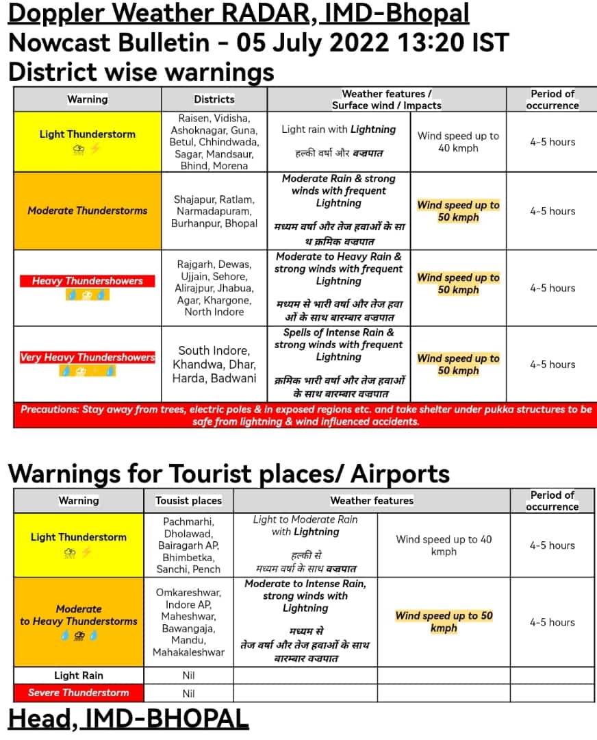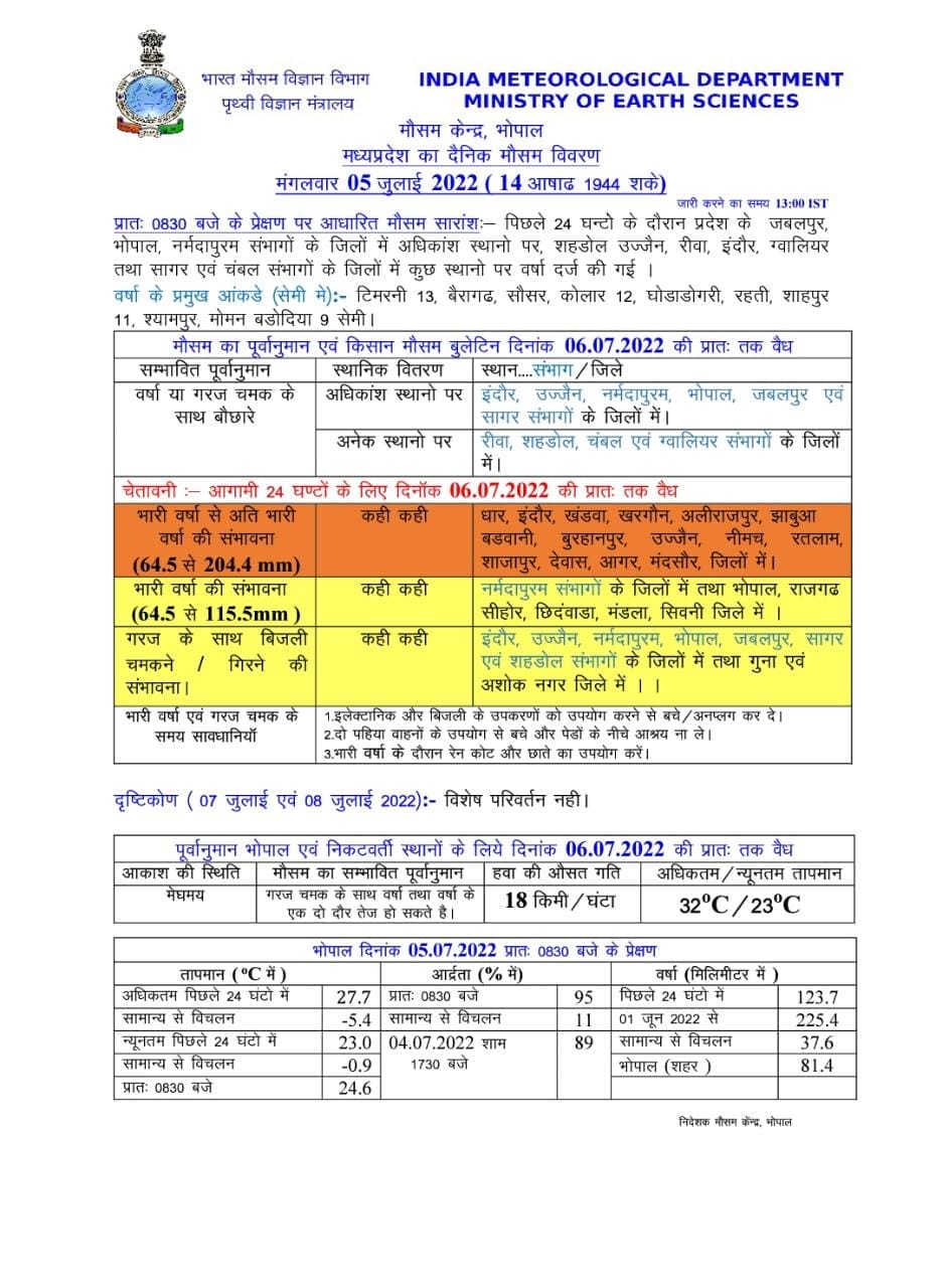 एमपी मौसम विभाग (MP Weather alert ) के अनुसार, आज मंगलवार 5 जुलाई 2022 को नर्मदापुरम संभाग के साथ धार,इंदौर, खंडवा, खरगोन, अलीराजपुर, झाबुआ, बड़वानी, बुरहानपुर, उज्जैन ,नीमच, रतलाम, शाजापुर, देवास, आगर, मंदसौर, भोपाल, राजगढ़, सीहोर, छिंदवाड़ा, मंडला, सिवनी, जिलों में अति भारी बारिश से भारी बारिश को लेकर ऑरेंज- येलो अलर्ट जारी किया गया है। वही भोपाल, नर्मदापुरम, इंदौर, उज्जैन, सागर, जबलपुर और शहडोल संभाग के साथ गुना और अशोकनगर में गरज चमक के साथ बिजली गिरने और चमकने की चेतावनी जारी की गई है।