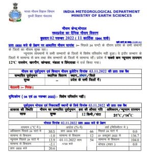 एमपी मौसम विभाग (MP Weather Update) के मुताबिक, पिछले 24 घंटों के दौरान मध्य प्रदेश के सभी संभागों के जिलों का मौसम मुख्यत: शुष्क रहा। न्यूनतम तापमानों में सभी संभागों के जिलों में विशेष परिवर्तन नहीं हुआ। भोपाल, इंदौर एवं नर्मदापुरम संभागों के जिलों में न्यूनतम तापमान सामान्य से कम रहा । मध्यप्रदेश में सबसे कम 11.5 डिग्री सेल्सियस तापमान रायसेन में दर्ज किया गया। शेष संभागों के जिलों में सामान्य रहे। चार नवंबर तक मौसम के यूं ही बने रहने के आसार है।