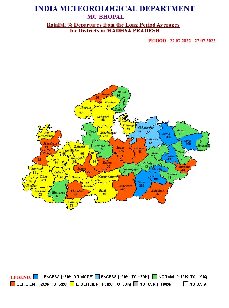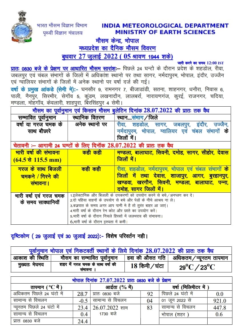 भोपाल, डेस्क रिपोर्ट। वर्तमान में 3 वेदर सिस्टम एक्टिव है और मानसून ट्रफ के उत्तर भारत की तरफ खिसकने के संकेत मिले हैं,ऐसे में आज से बारिश में कमी आएगी। एमपी मौसम विभाग (MP Weather Department) ने आज बुधवार 27 जुलाई 2022 को सभी संभागों में हल्की से मध्यम बारिश और 7 जिलों में भारी बारिश की चेतावनी जारी की है। वही 5 संभागों और 12 जिलों में बिजली गिरने और चमकने का भी येलो अलर्ट जारी किया गया है। बुधवार काे अनूपपुर, शहडाेल, डिंडाेरी, बालाघाट, मंडला, सिवनी, विदिशा, रायसेन, भिंड, मुरैना, शिवपुरी जिलाें बारिश के साथ भाेपाल, इंदौर, जबलपुर में बादल छाए रहेंगे।