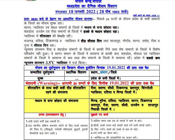 भोपाल, डेस्क रिपोर्ट। मध्य प्रदेश (MP Weather Update Today) के मौसम में बदलाव का दौर जारी है। बर्फीली हवाओं के चलते ठंड और शीतलहर का कहर जारी है और कई जिलों में कोहरा भी छाया हुआ है। पिछले 24 घंटे में सबसे न्यूनतम तापमान ग्वालियर में 3.5 डिग्री सेल्सियस दर्ज किया गया है। एमपी मौसम विभाग ने आज मंगलवार 18 जनवरी 2022 को 9 जिलों में शीतलदिन से तीव्र शीतलदिन (Cold Day) और 13 जिलों में मध्यम से घने कोहरे (Fog) के चलते येलो अलर्ट जारी किया गया है।वही नए वेदर सिस्टम बनने से 3-4 दिन बाद फिर बारिश (Rain) के संकेत मिल रहे है।