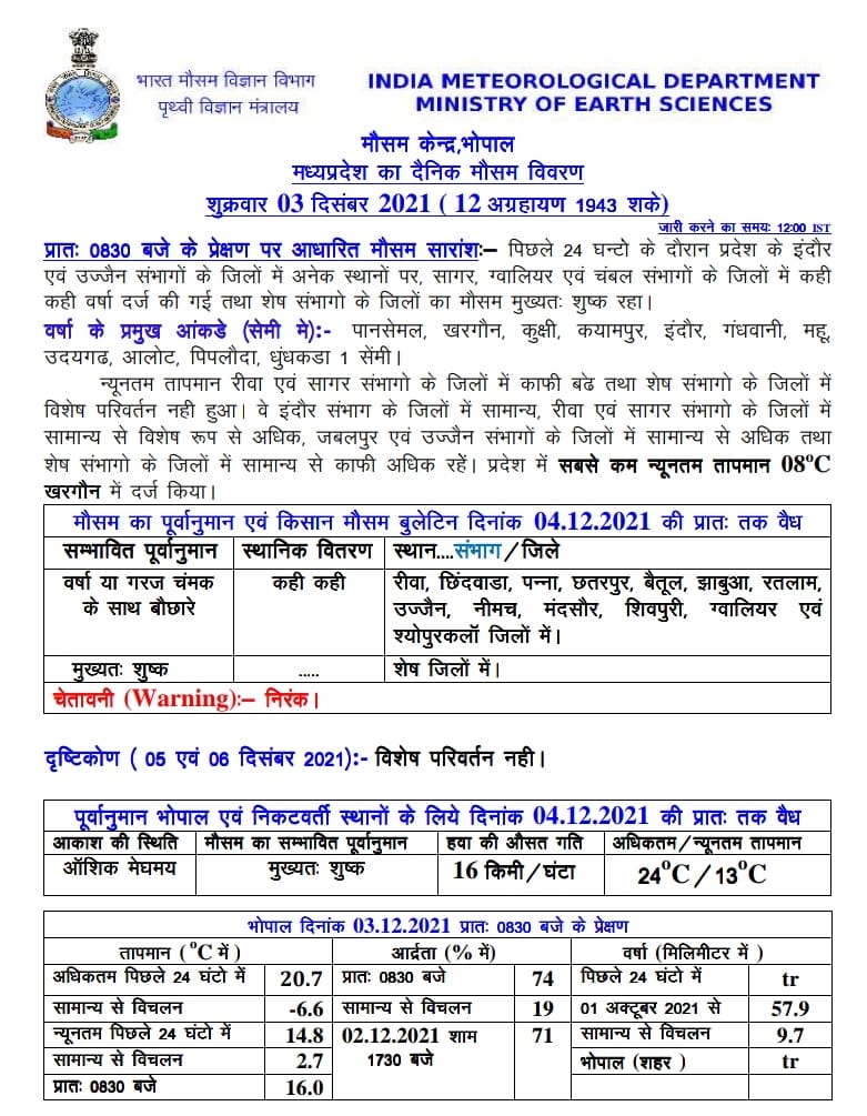 भोपाल, डेस्क रिपोर्ट। दिसंबर का महीना लगते ही मध्य प्रदेश का मौसम (MP Weather Update) एकदम से बदल गया है और अरब सागर और बंगाल की खाड़ी में बने वेदर सिस्टम के कारण बारिश का दौर शुरु हो गया है। एमपी मौसम विभाग (MP Weather Department) ने आज शुक्रवार 3 दिसंबर 2021 को 13 जिलों में बारिश की संभावना जताई है। वही बादल छंटने के बाद से रात का पारा और नीचे आएगा। हालांकि, अधिकतम तापमान ज्यादा नीचे नहीं आएगा। आने वाले दिनों में कड़ाके की ठंड़ पड़ने के आसार है।