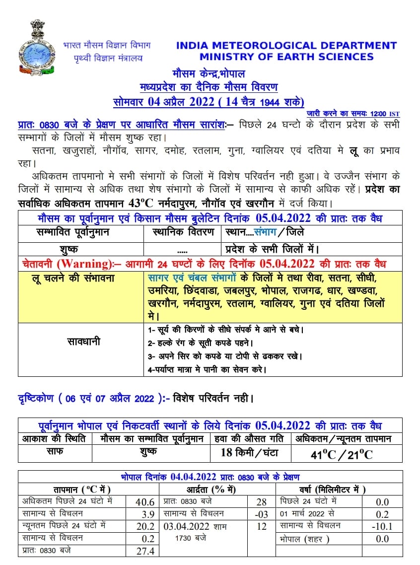एमपी मौसम विभाग (MP Weather Report) के अनुसार, आज 4 अप्रैल 2022 को सागर, चंबल संभाग के साथ रीवा, सतना, सीधी, उमरिया, छिंदवाड़ा, जबलपुर, भोपाल, राजगढ़, धार, खंडवा, खरगोन, नर्मदापुरम, रतलाम, ग्वालियर, गुना और दतिय आदि जिलों लू का येलो अलर्ट जारी किया गया है। पिछले 24 घंटे में सबसे अधिकतम तापमान 43 डिग्री सेल्सियस खरगोन, नौगांव और नर्मदापुरम में दर्ज किया गया है ।पिछले 24 घंटे में सभी जिले शुष्क रहे लेकिन सतना, खजुराहो, नौगांव, सागर, दमोह, रतलाम, गुना, ग्वालियर और दतिया में लू का असर रहा।आगामी दो दिन में इंदौर और भोपाल में अधिकतम तापमान 40 डिग्री तक पहुंचने की संभावना हैं।