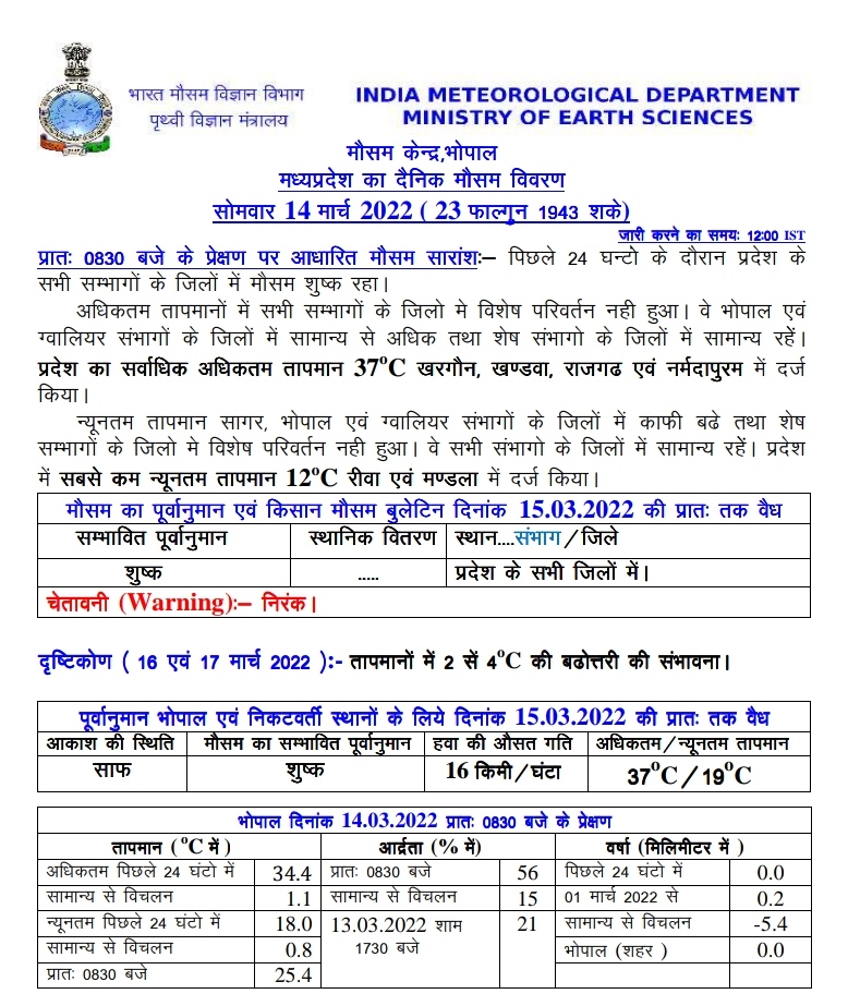भोपाल, डेस्क रिपोर्ट। मध्य प्रदेश (MP Weather Update Today 14 March 2022) में होली से पहले कई जिलों में तापमान में बढ़ोतरी होने लगी है। गुजरात की तरफ से आ रही गर्म हवाओं चलते मध्यप्रदेश में दिन और रात के तापमान में उतार-चढ़ाव देखने को मिल रहा है।एमपी मौसम विभाग (MP Weather Department) ने आज 14 मार्च 2022सोमवार को फिर सभी जिलों में मौसम के शुष्क रहने की संभावना है और 16 किमी/ घंटे की रफ्तार से हवा चल सकती है।इधर नीमच, मंदसौर, खरगोन, खंडवा, धार जैसे जिलों में लू चलने की संभावना बनी हुई है।