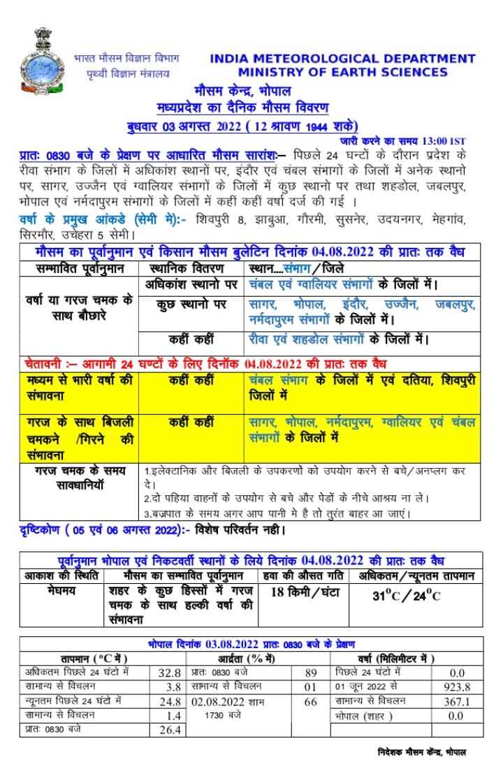 एमपी मौसम विभाग (MP Weather alert ) के अनुसार, आज बुधवार 3 अगस्त सभी संभागों में कहीं कहीं या अनके स्थानों पर गरज चमक के साथ भारी से मध्यम बारिश की संभावना है।चंबल संभाग के साथ दतिया और शिवपुरी जिलों में भारी बारिश के साथ ग्वालियर चंबल संभाग में गरज चमक के साथ अधिकांश हिस्सों में बारिश की चेतावनी जारी की जारी है।इसके अलावा इंदौर, भोपाल, उज्जैन, जबलपुर, सागर और नर्मदापुरम संभागों में कुछ स्थानों पर और रीवा-शहडोल संभाग में गरज चमक के कहीं कहीं बारिश की चेतावनी दी गई है। इसके अलावा भोपाल, नर्मदापुरम, सागर, चंबल और ग्वालियर संभागों में बिजली गिरने और चमकने के लिए येलो अलर्ट जारी किया गया है।