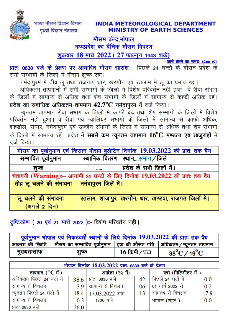 मौसम विभाग (MP Weather Report) के मुताबिक, आज 18 मार्च 2022 को नर्मदापुरम जिले में तीव्र लू चलने और रतलाम, शाजापुर, खरगोन, धार, खंडवा और राजगढ़ जिलों में लू चलने के चलते येलो अलर्ट जारी किया गया है। पिछले 24 घंटे में सभी जिलों में मौसम शुष्क रहा।नर्मदापुरम में तीव्र तो रतलाम, राजगढ़, खरगोन और धार में भी लू का असर देखने को मिला। सबसे न्यूनतम तापमान 16 डिग्री सेल्सियस मंडला और खजुराहों में दर्ज किया गया। वही सबसे अधिकतम तापमान नर्मदापुरम, धार और रतलाम में 42.7 नर्मदापुरम डिग्री सेल्सियस दर्ज किया गया।