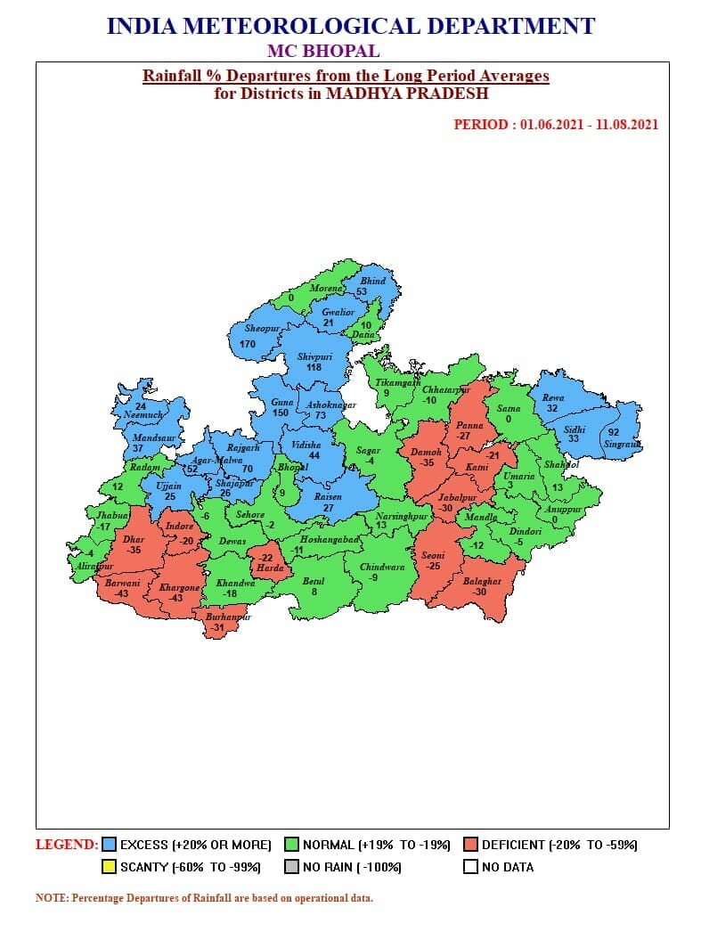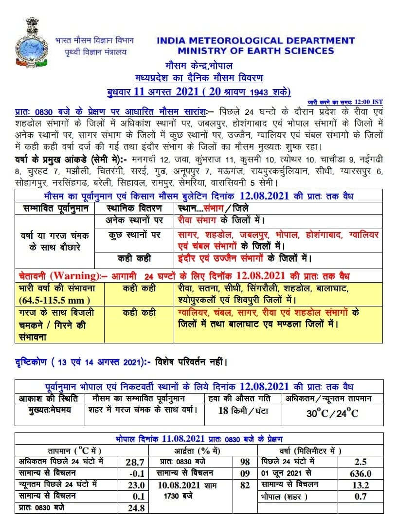 मौसम विभाग (MP Weather Alert) ने आज बुधवार 11 अगस्त 2021 को उज्जैन, होशंगाबाद, ग्वालियर-चंबल, भोपाल, शहडोल, जबलपुर, इंदौर, सागर, रीवा संभाग के जिलों में कहीं कहीं बौछारें पड़ने की संभावना हैं। वही रीवा, सतना, सीधी, सिंगरौली, शहडोल, बालाघाट, श्योपुर और शिवपुरी जिले में भारी बारिश (Heavy Rain) की चेतावनी के साथ मौसम विभाग ने यलो अलर्ट (Yellow alert) जारी किया है।ग्वालियर-चंबल, सागर, रीवा और शहडोल संभागों के साथ बालाघाट और मंडला में बिजली गिरने और चमकने के आसार है। इसके साथ ही बिजली चमकने और गिरने के साथ 18 प्रति घंटा की रफ्तार से हवा चलने के भी आसार है।