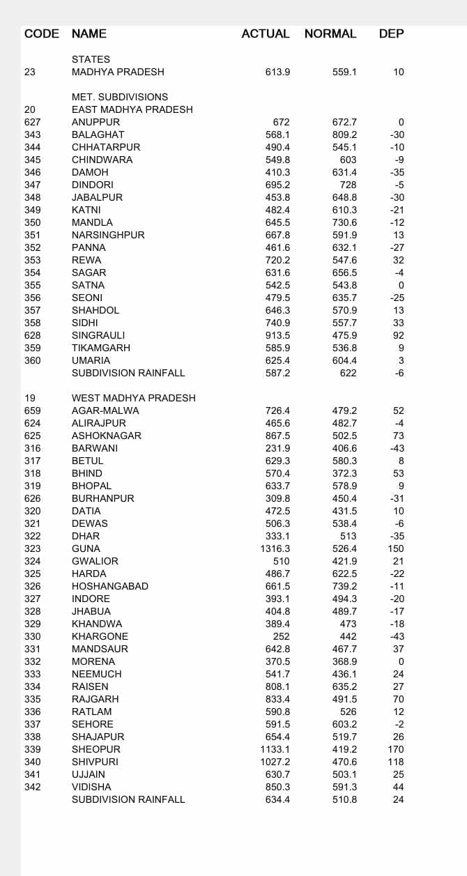 मंगलवार को सुबह साढ़े आठ बजे से शाम साढ़े पांच बजे तक गुना में 21, पचमढ़ी में 20, सतना में 10, नरसिंहपुर में सात, रीवा में चार, छिंदवाड़ा में तीन, जबलपुर में 1.7, दमोह, मलाजखंड में एक, सागर में 0.2 मिलीमीटर बारिश हुई। राजधानी में कहीं-कहीं बूंदाबांदी हुई।
