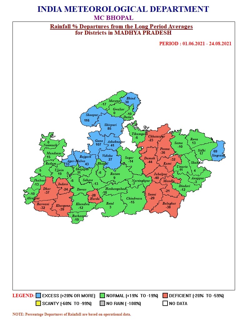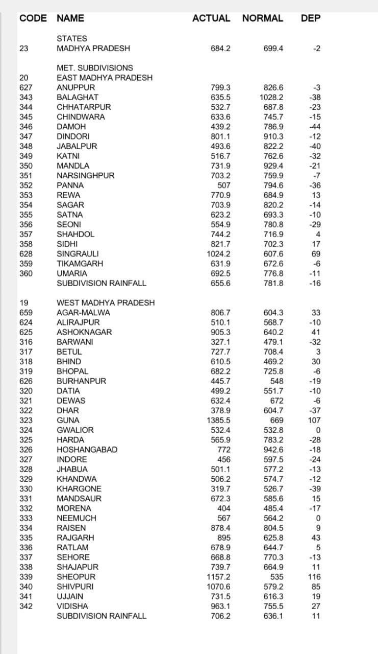 अबतक हुई बारिश में कई जिलों को तरबतर कर दिया है, लेकिन मालवा-निमाड़ अब भी प्यासा है, यहां हालात बिगड़ते हुए नजर आ रहे है, वही जबलपुर समेत बुंदेलखंड भी सूखे की कगार पर है। भिंड, श्योपुर, शिवपुरी, गुना, अशोकनगर, विदिशा, राजगढ़, आगर-मालवा, शाजापुर, उज्जैन, मंदसौर और सिंगरौली में सबसे ज्यादा बारिश हुई है। वही इंदौर, धार, खरगोन, बड़वानी, हरदा, पन्ना, दमोह, कटनी, जबलपुर, सिवनी, छतरपुर, मंडला और बालाघाट सूखे की चपेट में है। इनमें मंदसौर, रतलाम, शाजापुर और सीधी में हालात सामान्य है।