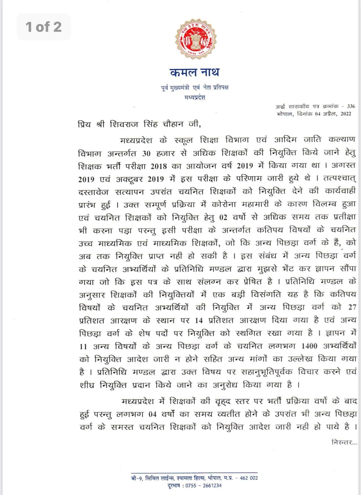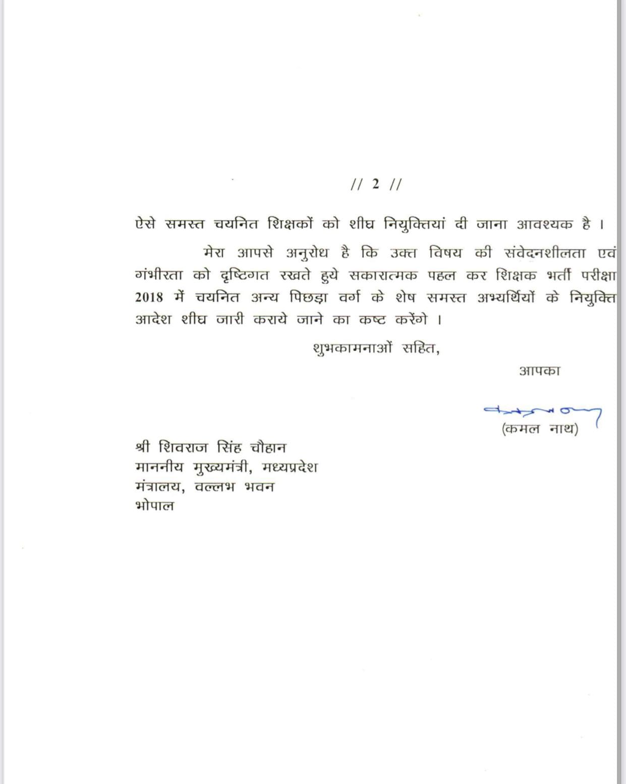 कमलनात ने लिखा है कि प्रतिनिधि मण्डल द्वारा उक्त विषय पर सहानुभूतिपूर्वक विचार करने एवं शीघ्र नियुक्ति प्रदान किये जाने का अनुरोध किया गया है । मध्यप्रदेश में शिक्षकों की बड़े स्तर पर भर्ती प्रक्रिया वर्षो के बाद हुई परन्तु लगभग 04 वर्षों का समय व्यतीत होने के उपरांत भी अन्य पिछड़ा वर्ग के समस्त चयनित शिक्षकों को नियुक्ति आदेश जारी नही हो पाये है । ऐसे समस्त चयनित शिक्षकों को शीघ्र नियुक्तियां दी जाना आवश्यक है ।कमलनाथ ने मांग की है कि उक्त विषय की संवेदनशीलता एवं गंभीरता को दृष्टिगत रखते हुये सकारात्मक पहल कर शिक्षक भर्ती परीक्षा 2018 में चयनित अन्य पिछड़ा वर्ग के शेष समस्त अभ्यर्थियों के नियुक्ति आदेश शीघ्र जारी कराये जाने का कष्ट करेंगे।