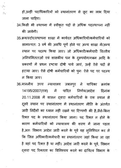 नई पॉलिसी (New Transfer Policy 2021) के मुताबिक क्रय, स्टोर और शाखा में कार्यरत अधिकारियों-कर्मचारियों को सामान्यत: 3 साल की अवधि पूर्ण होने पर ही अन्य शाखा या स्थान पर पदस्थ किया जाएगा।जो अधिकारी-कर्मचारी वित्त अनियमितता और शासकीय धन के दुरुपयोग में दोषी पाए गए है, उनका ट्रांसफर नहीं होगा।उन्हें पद से हटाया जाएगा।वही दोबारा से पद पर पदस्थ नहीं किया जाएगा।