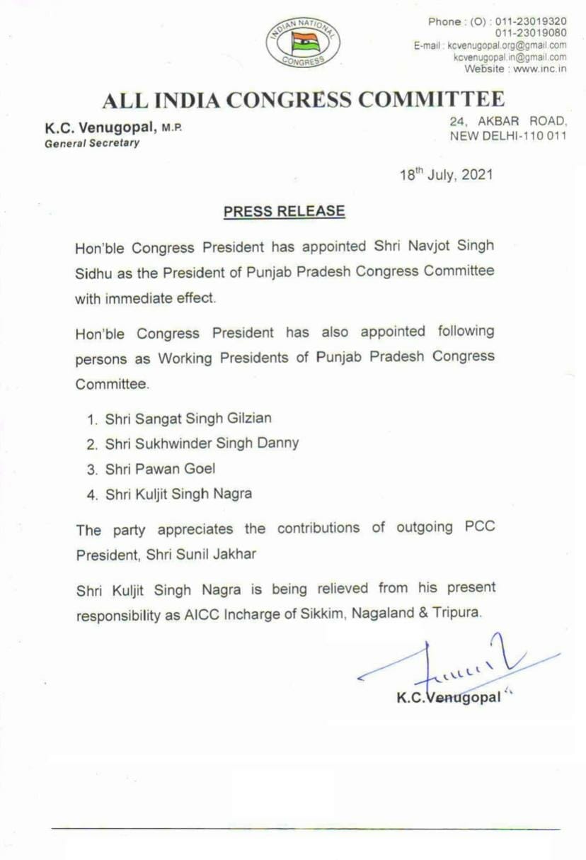 इसके अलावा पंजाब विधानसभा चुनाव (punjab assembly election) को देखते हुए चार वर्किंग प्रेसिडेंट भी बनाए गए हैं। इसके लिए केसी वेणुगोपाल की तरफ से पत्र जारी कर दिया गया है। पत्र में लिखा है कि कांग्रेस अध्यक्ष सोनिया गांधी (Sonia Gandhi) ने नवजोत सिंह सिद्धू को लेकर यह फैसला लिया है।