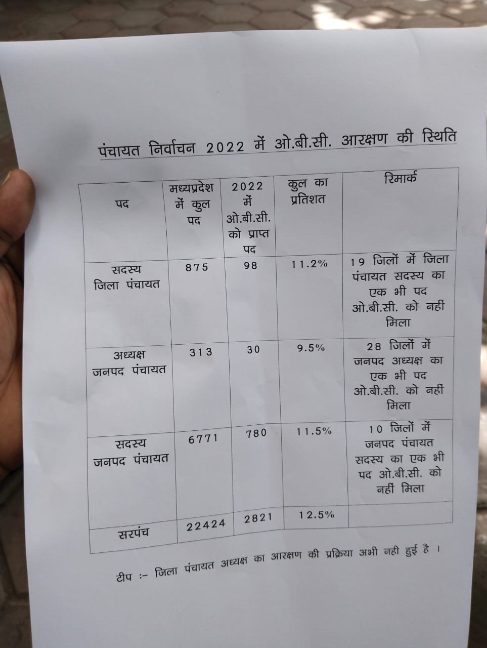 मध्यप्रदेश की शिवराज सरकार ने पंचायत चुनाव में अन्य पिछड़ा वर्ग के साथ घोर अन्याय किया है। 2022 के पंचायत चुनाव में भाजपा सरकार ने ओबीसी वर्ग को जिला पंचायत सदस्य की मात्र 11.2 % सीटें, जनपद पंचायत अध्यक्ष की मात्र 9.5 % सीटें, जनपद पंचायत सदस्य की मात्र 11.5 % सीटें और सरपंच की मात्र 12.5 % सीटें दी हैं । यही नहीं..अन्य पिछड़ा वर्ग को 19 जिलों में जिला पंचायत सदस्य के शून्य पद, 28 जिलों में जनपद पंचायत अध्यक्ष के लिए शून्य पद और 10 जिलों में जनपद पंचायत सदस्य के लिए शून्य पद दिए है।