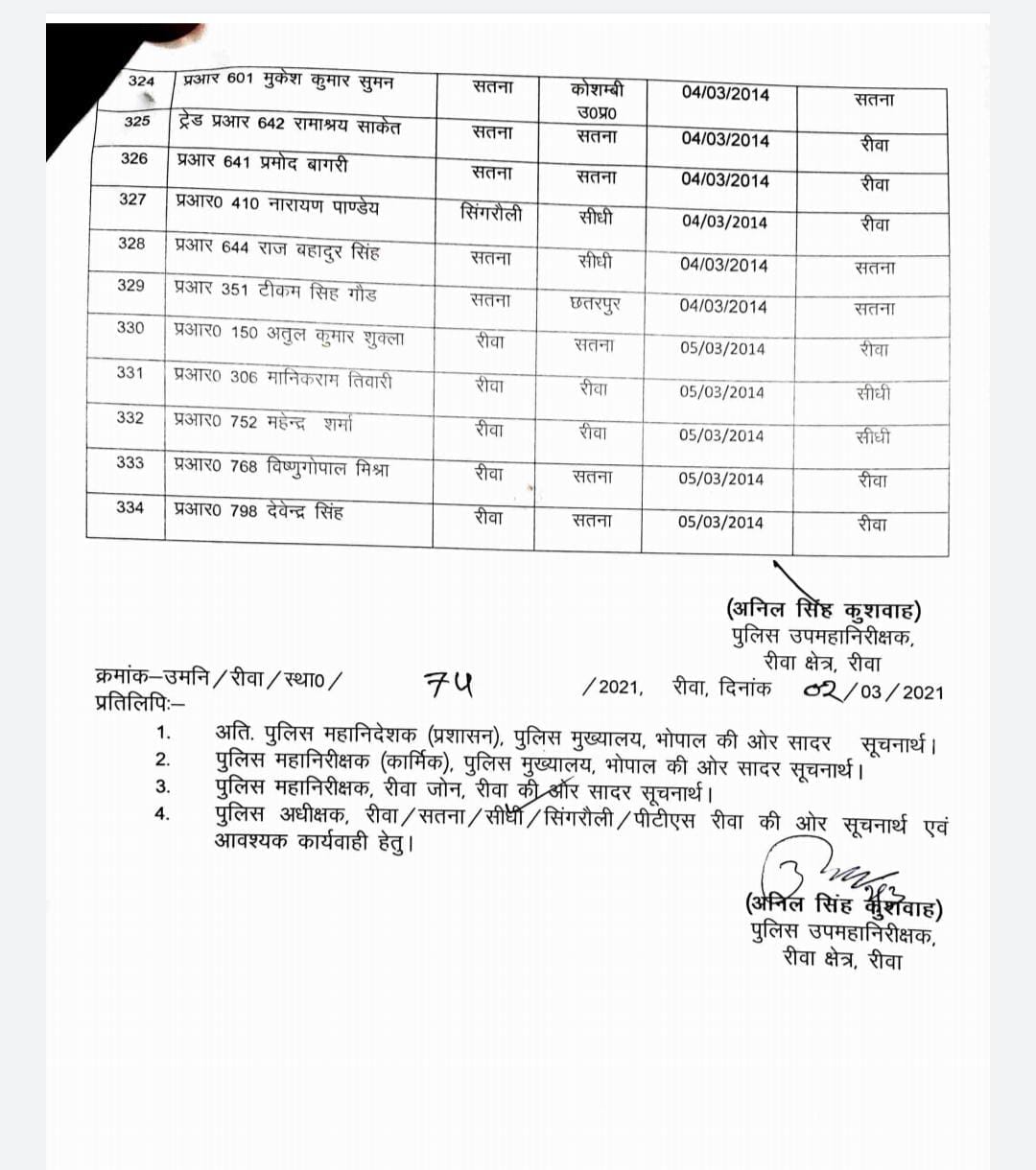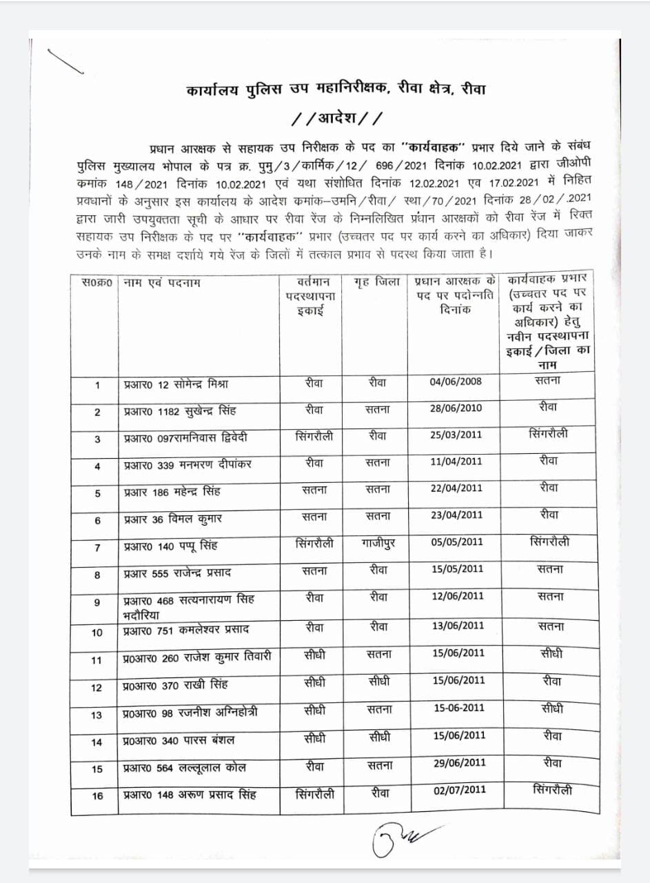 भोपाल, डेस्क रिपोर्ट। मध्य प्रदेश (Madhya Pradesh) में अधिकारियों के तबादले (Transfer) और प्रमोशन (Promotion) का दौर जारी है। आए दिन आईएएस-आईपीएस (IAS-IPS) अधिकारियों के प्रमोशन-तबादले(Promotion-Transfer) हो रहे है। इसी कड़ी में आज 2 मार्च मध्य प्रदेश बजट 2021 (Madhya Pradesh Budget 2021) के बीच रीवा संभाग ((Rewa Division) में प्रधान आरक्षकों को पदोन्नति दी गई।