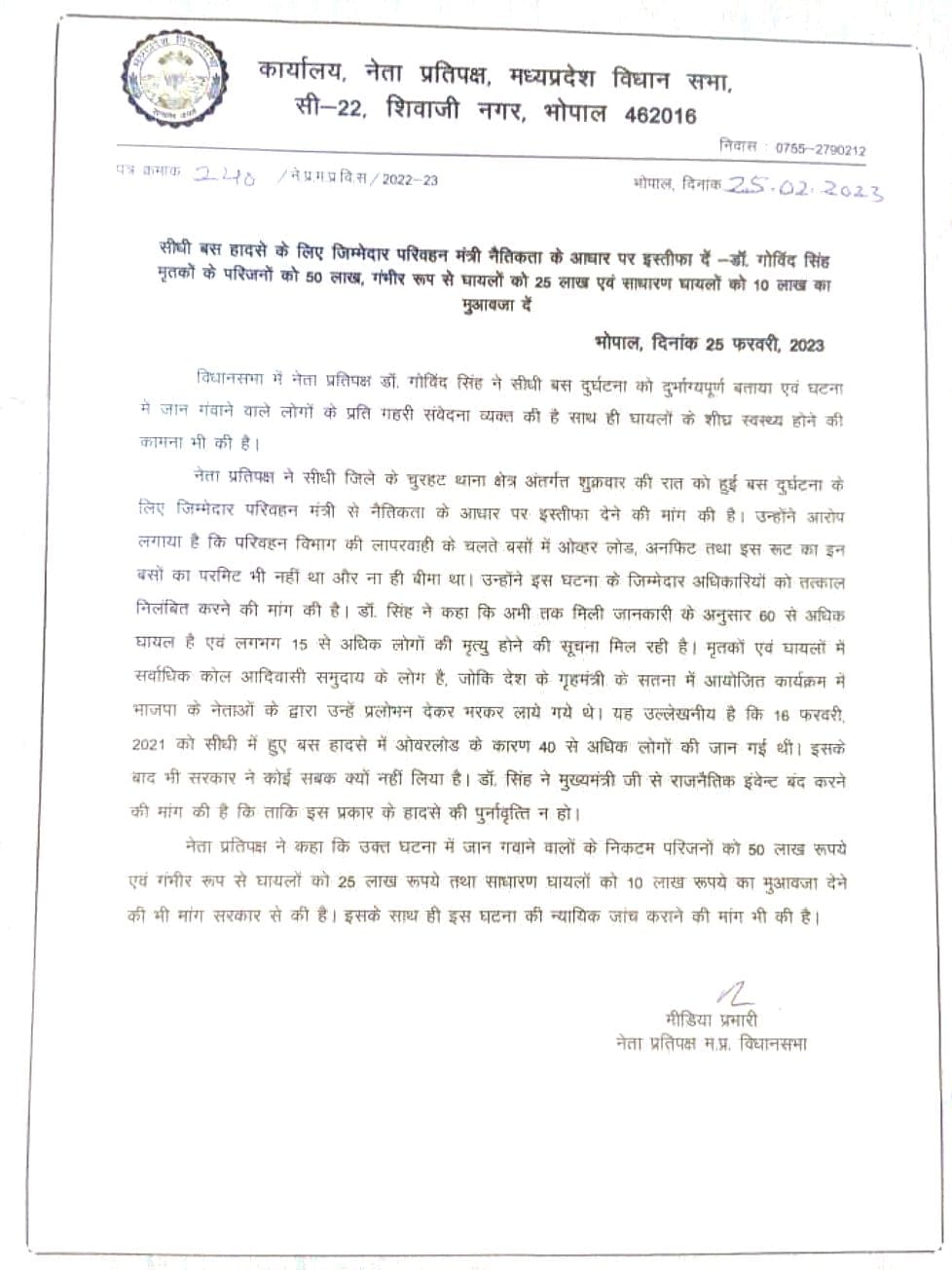 नेता प्रतिपक्ष ने सीधी जिले के चुरहट थाना क्षेत्र अंतर्गत शुक्रवार की रात को हुई बस दुर्घटना के लिए परिवहन मंत्री गोविंद सिंह राजपूत से नैतिकता के आधार पर इस्तीफा देने की मांग की है। उन्होंने आरोप लगाया है कि परिवहन विभाग की लापरवाही के चलते बसों में ओवर लोड, अनफिट तथा इस रूट का इन बसों का परमिट भी नहीं था और ना ही बीमा था। उन्होंने इस घटना के जिम्मेदार अधिकारियों को तत्काल निलंबित करने की मांग की है। डाॅ. सिंह ने कहा कि अभी तक मिली जानकारी के अनुसार 60 से अधिक घायल है एवं लगभग 15 से अधिक लोगों की मृत्यु होने की सूचना मिल रही है। मृतकों एवं घायलों में सर्वाधिक कोल आदिवासी समुदाय के लोग है, जोकि देश के गृहमंत्री के सतना में आयोजित कार्यक्रम में भाजपा के नेताओं के द्वारा उन्हें प्रलोभन देकर भरकर लाये गये थे।