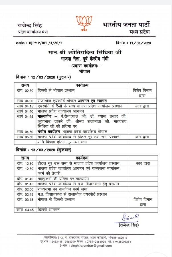 कार्यालय पहुंचकर सिंधिया सबसे पहले पं. दीनदयाल उपाध्याय, श्रीमंत राजामाता विजयाराजे सिंधिया , मध्यप्रदेश भाजपा के पितृपुरूष कुशाभाऊ ठाकरे की प्रतिमा के चित्र पर माल्यार्पण करेंगे। सिंधिया रात्रि विश्राम भोपाल में ही करेंगे। 13 मार्च को दोपहर 12 बजे सिंधिया फिर भाजपा कार्यालय पहुंचेंगे और वरिष्ठ नेताओं के चित्र पर माल्यार्पण करने के पश्चात राज्यसभा चुनाव के लिए नामांकन दाखिल करने विधानसभा परिसर जायेंगे।