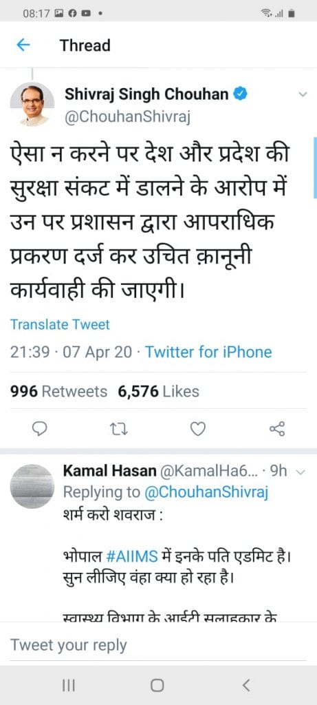 शिवराज ने अपने ट्वीट में यह भी लिखा है कि प्रदेश से निजामुद्दीन मरकज में गए हुए सभी नागरिकों और विदेश से आकर मस्जिदों में छिपे हुए व्यक्तियों की पहचान कर सबको प्रशासन ने क्वॉरेंटाइन कर दिया है। दरअसल प्रशासन मैं मध्यप्रदेश में भी ऐसे बहुत सारे जमातियो को चिन्हित किया है जो बिना सूचना के मध्यप्रदेश में रह रहे थे और इंदौर और भोपाल में कोरोना संक्रमण की बड़ी वजह यही जमाती हैं। अब शिवराज सिंह चौहान ने इनके खिलाफ सख्त रुख अपनाते हुए 24 घंटे का अल्टीमेटम दिया है।
