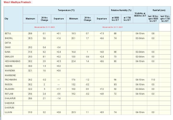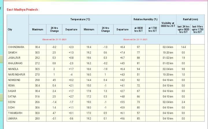 मौसम विभाग (MP Weather Forecast) का पूर्वानुमान है कि आज 22 नवंबर 2021 को होशंगाबाद संभाग के जिलों,खंडवा, खरगोन, बड़वानी, अलीराजपुर, झाबुआ, डिंडौरी, छिंदवाड़ा, सिवनी, मंडला और बालाघाट जिलों में बारिश की संभावना है। वही 16 किमी की रफ्तार से हवा चलने की संभावना है।वही इंदौर में 20 नवंबर तक बारिश का असर रहेगा ।आज रविवार को गरज-चमक के साथ बारिश होगी। 21 नवंबर के बाद इंदौर में ठंड के साथ कोहरे का असर भी दिखाई देगा।