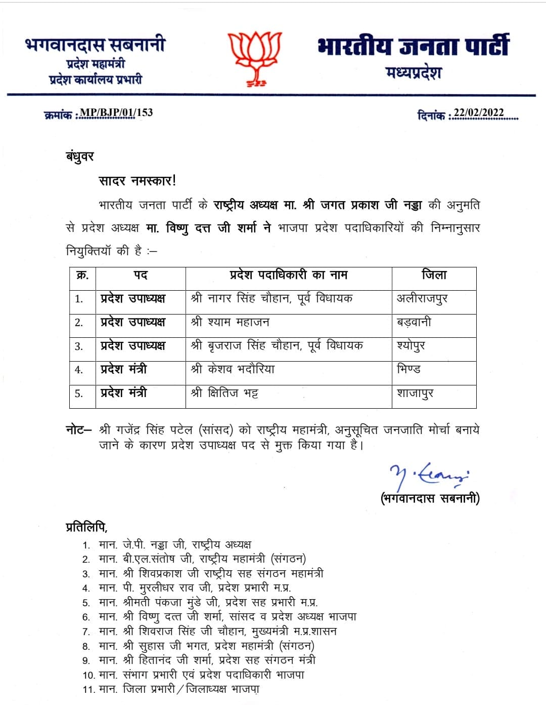 भोपाल, डेस्क रिपोर्ट। आगामी चुनावों से पहले मध्य प्रदेश में बीजेपी (MP BJP) में संगठन को मजबूत करने की कवायद जारी है।अब प्रदेश में पदाधिकारियों की नियुक्ति की गई है।यह नियुक्ति बीजेपी के राष्ट्रीय अध्यक्ष जेपी नड्डा (JP Nadda) की अनुमति से मध्य प्रदेश के बीजेपी अध्यक्ष वीडी शर्मा(VD Sharma) ने की है। वही बीजेपी सांसद गजेन्द्र सिंह पटेल (BJP MP Gajendra Singh Patel) को अनुसूचित जनजाति मोर्चा का राष्ट्रीय महामंत्री बनाए जाने पर प्रदेश उपाध्यक्ष के पद से मुक्त कर दिया गया है।