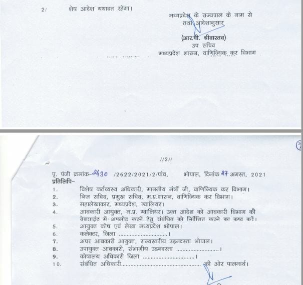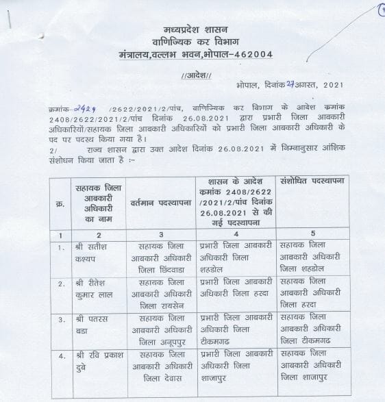 भोपाल, डेस्क रिपोर्ट। मध्य प्रदेश में तबादलों (Transfer In MP) का दौर जारी है। एक बार फिर आबकारी अधिकारियों (excise officer) को इधर से उधर किया गया है। इस संबंध में वाणिज्यिक कर विभाग (commercial tax department) ने आदेश जारी कर दिया है।