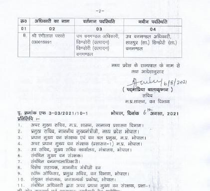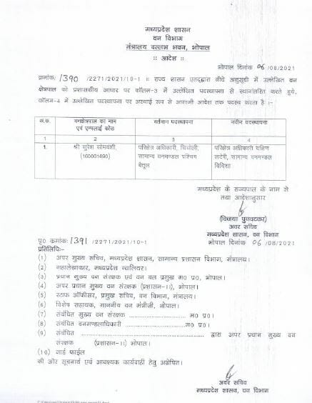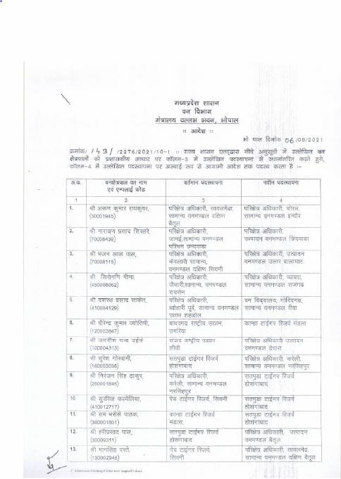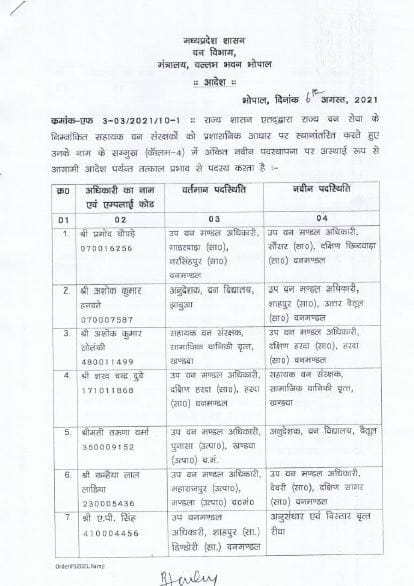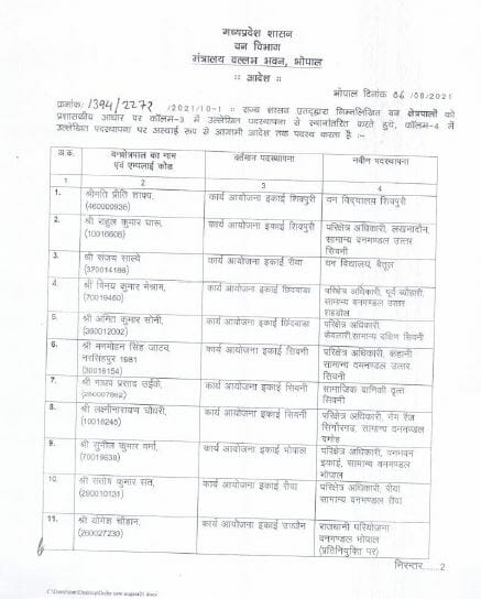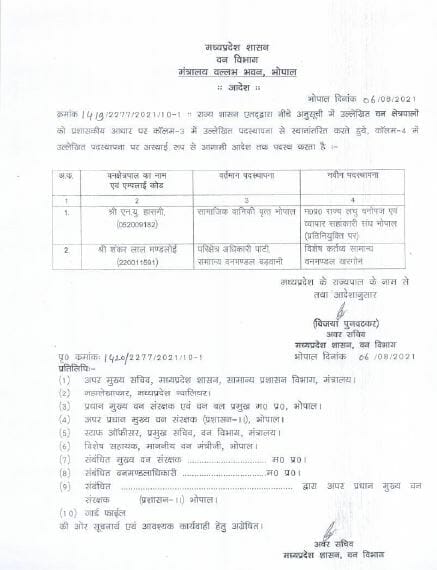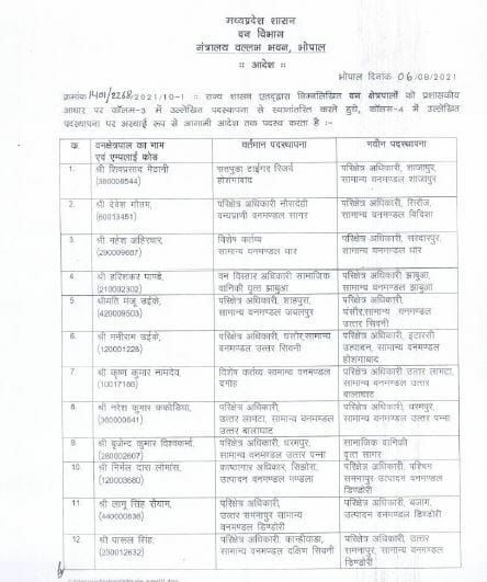 भोपाल, डेस्क रिपोर्ट। आगामी उपचुनाव से पहले मध्य प्रदेश (Madhya Pradesh) में तबादलों (Transfer) का सिलसिला जारी है, अब राज्य शासन (MP Government) ने वन विभाग में थोकबंद तबादले किये हैं। इस संबंध में वन विभाग (Forest Department) द्वारा तबादला सूची जारी की गई है।