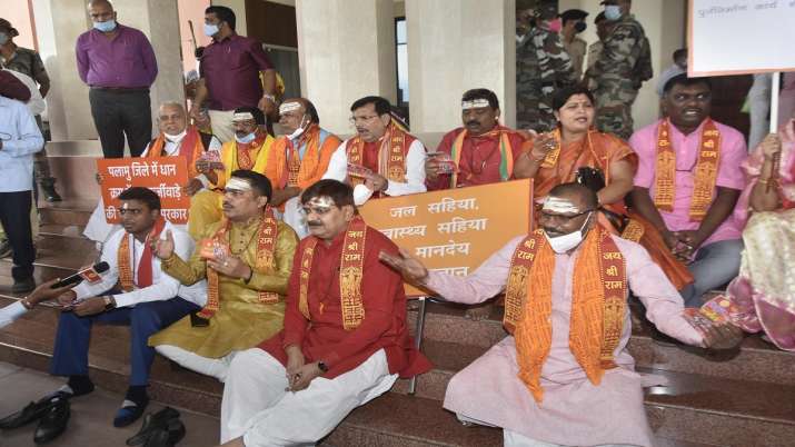 दिन की शुरुआत से पहले भाजपा विधायकों ने विधानसभा के प्रवेश द्वार पर सीढ़ियों पर बैठकर हनुमान चालीसा का जाप किया, जबकि देवघर के विधायक नारायण दास (deoghar MLA Narayan Das) ने ‘बेलपत्र’ की माला पहनी। भाजपा नमाज कक्ष आवंटन से संबंधित आदेश को वापस लेने की मांग कर रही है। विधानसभा अध्यक्ष ने नमाज अदा करने के लिए कमरा नंबर टीडब्ल्यू 348 आवंटित किया है, जिससे भाजपा की ओर से विधानसभा परिसर में हनुमान मंदिर और अन्य धर्मों के पूजा स्थलों के निर्माण की मांग की गई है।