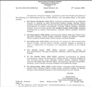 हिमाचल प्रदेश में एक बार फिर प्रशासनिक फेरबदल किया गया है। राज्य की सुखविंदर सिंह सुख्खू सरकार ने 6 एचएएस (हिमाचल प्रशासनिक सेवा) अधिकारियों के तबादले किए हैं। इनमें चार अधिकारियों का तबादला किया गया है, जबकि नियुक्ति का इंतजार कर रहे दो अधिकारियों को नई जिम्मेदारी सौंपी गई है। इस संबंध में कार्मिक विभाग, हिमाचल प्रदेश शासन ने 27 जनवरी 2026 (मंगलवार) को आदेश जारी किए हैं।