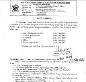 - प्रोटेक्शन अलाउंस विशेष रूप से उन कर्मचारियों के लिए है जो जोखिम भरे क्षेत्रों या विशिष्ट डिवीजनों में काम कर रहे हैं। यह भत्ता सोलन, सुंदरनगर और कांगड़ा के पीएंडटी डिवीजनों (Protection & Testing) में कार्यरत स्टाफ को प्रदान किया जाएगा।