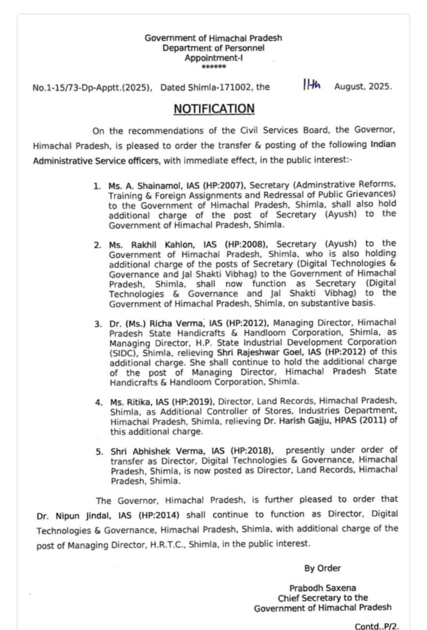 - डॉ. निपुण जिंदल निदेशक, डिजिटल प्रौद्योगिकी एवं शासन के रूप में कार्य करते रहेंगे। प्रबंध निदेशक, एचआरटीसी शिमला का भी अतिरिक्त कार्यभार