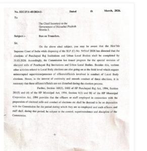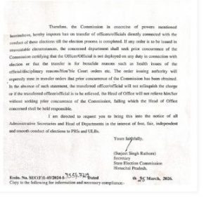 हिमाचल प्रदेश के सरकारी अधिकारियों और कर्मचारियों के लिए महत्वपूर्ण खबर है। राज्य में आगामी दिनों में होने वाले पंचायती राज संस्थाओं और शहरी स्थानीय निकायों के चुनाव के चलते राज्य निर्वाचन आयोग ने अधिकारियों-कर्मचारियों के तबादलों पर रोक लगा दी गई है।