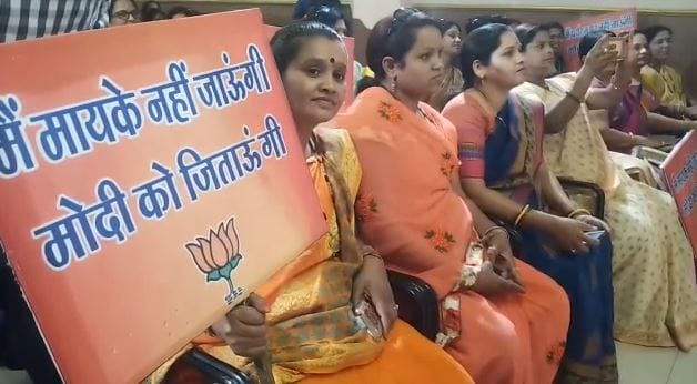 एक कार्यक्रम के तहत लोकसभा स्पीकर सुमित्रा महाजन ने महिलाओ से बीजीपी को वोट देने का संकल्प लेने और घर घर से भाजपा को वोट देने की बात का संकल्प बीजेपी महिला मोर्चा कार्यकर्ताओ को दिलाया। अक्सर देखा जाता है की गर्मी में जब स्कूलों की छुट्टियों रहती है तो महिलाये मायके जाती है या परिजन कही घूमने निकल जाते है और इस बार 19 मई इंदौर में लोकसभा मतदान है और मतदान के समय महिला मतदाता शहर से बाहर नहीं जाए इसको लेकर इंदौर में बीजेपी ने केम्पेन शुरू किया जिसके तहत चुनाव तक लगातार बीजीपी महिला मोर्चे की महिलाये “मैं मायके नहीं जाउंगी मोदी जी को जिताऊँगी केम्पेन” के तहत सामाजिक और धार्मिक कार्यक्रम में जाकर मोदी को वोट देने की अपील करेगी| साथ ही महिलाओ को समझाइश देंगी कि वे चुनाव की तिथि तक मायके या फिर घूमने नहीं जाए अगर जाते भी है तो मतदान के पहले वापस आ जाये और मतदान करे। इंदौर से शुरू हुए अनूठे कैंपेन ने पहले दिन तो जमकर सुर्खियां बटोरी अब देखना ये दिलचस्प होगा कि मिशन 2019 में बीजेपी की पहल कितना रंग लाएगी। इस मौके पर बीजेपी नेत्रियों सहित कई वरिष्ठ नेता शामिल थे।