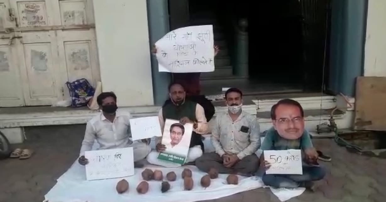 इंदौर में गांधी भवन कांग्रेस कार्यालय (congress office of indore) पर कांग्रेसियों ने नारियल की दुकान लगाई है, जिसको मुख्यमंत्री शिवराज घोषणा वीर नारियल की दुकान नाम दिया गया है। प्रदेश कांग्रेस कमेटी के सचिव विवेक खंडेलवाल, राजीव विकास केंद्र के अध्यक्ष देवेंद्र सिंह यादव और गिरीश जोशी द्वारा गांधी भवन के बाहर लगाई गई शिवराज घोषणा वीर नारियल दुकान पर प्रतीकात्मक तौर पर सीएम शिवराज को भी बिठाया गया है। साथ ही दुकान पर 50 करोड़ से 50 हजार करोड़ तक की तख्तियां लगाई गई है।