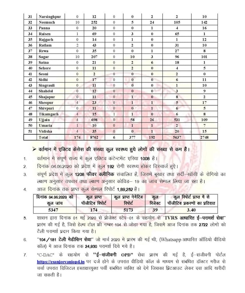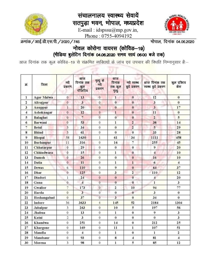 पिछले 24 घंटे में कुल 5347 सैंपल की जांच की गई जिसमें से 39 रिजेक्ट हो गए। वहीं 5173 नेगेटिव लेकिन 174 पॉजिटिव निकले। भोपाल में 58 पॉजिटिव मिले, एक मरीज की मृत्यु हो गई। अस्पतालों से 34 मरीजों को डिस्चार्ज किया गया। वहीं इंदौर में 36 पॉजिटिव मिले। वहीं 4 मरीजों की मृत्यु हो गई। बुरहानपुर में 11, नीमच में 10 और सागर में 10 पॉजिटिव मामलों के साथ स्थिति गंभीर हो रही है।