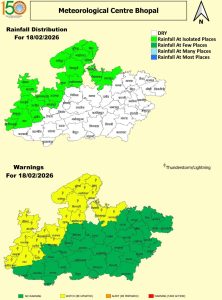 - बुधवार (18 फरवरी 2026): इंदौर, उज्जैन, ग्वालियर, धार, झाबुआ, आलीराजपुर, रतलाम, मंदसौर, नीमच, शाजापुर, राजगढ़, आगर-मालवा, गुना, अशोकनगर, शिवपुरी, श्योपुर, मुरैना, भिंड, दतिया, निवाड़ी, टीकमगढ़ और छतरपुर में मेघगर्जन, तेज हवा और हल्की से मध्यम बारिश होने की संभावना जताई गई है। भोपाल, देवास, खरगोन, बड़वानी, सीहोर, विदिशा, सागर, दमोह, पन्ना और सतना में बादल छाए रह सकते हैं।