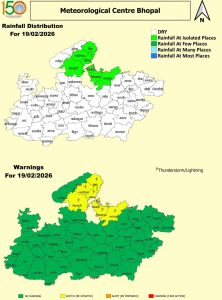 - गुरुवार (19 फरवरी 2026): ग्वालियर-चंबल संभाग के ग्वालियर, भिंड, दतिया, शिवपुरी, निवाड़ी, टीकमगढ़ और छतरपुर में गरज-चमक के साथ हल्की बारिश हो सकती है।
