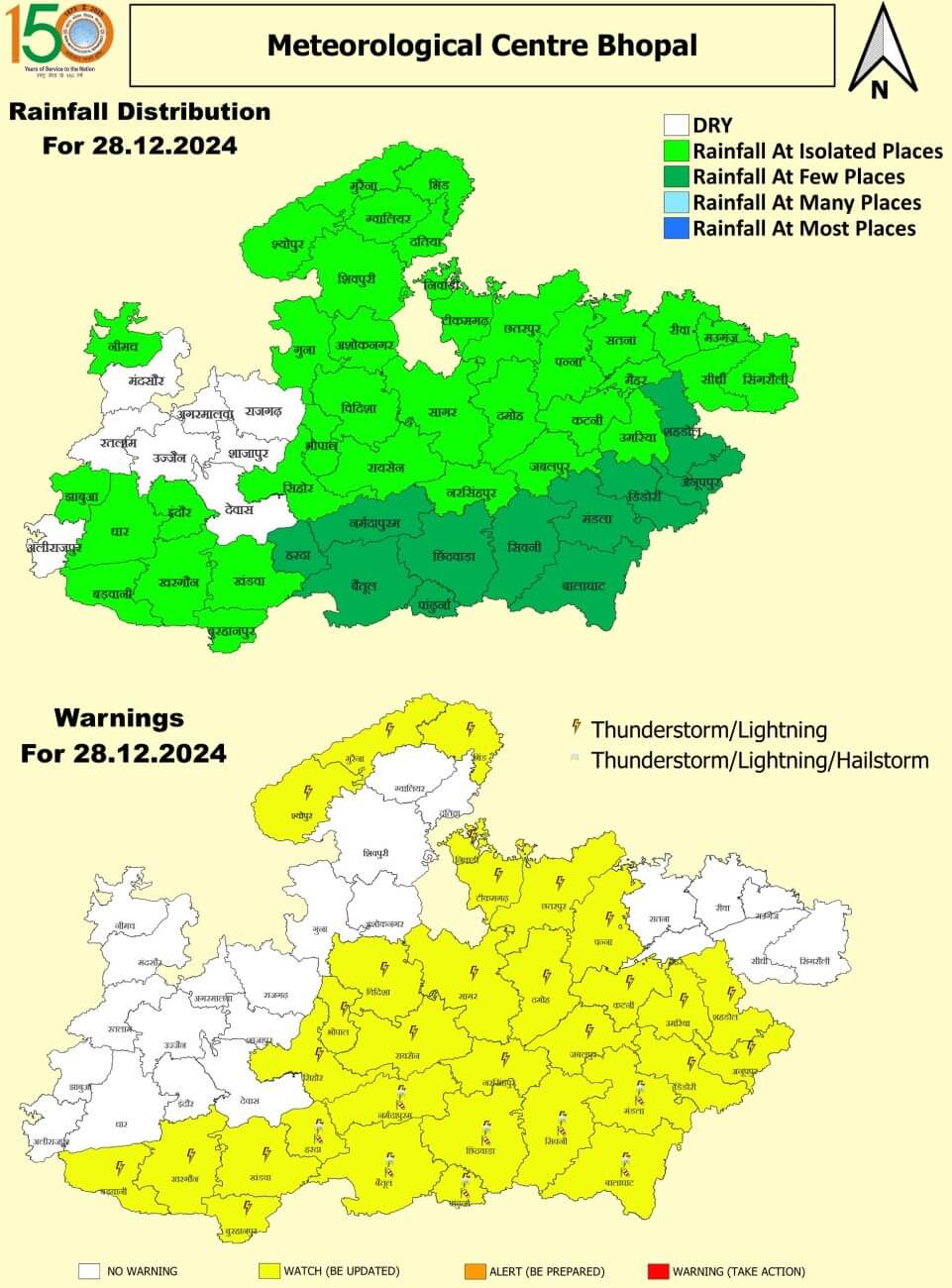 - भोपाल, विदिशा, रायसेन, सीहोर, राजगढ़, हरदा, बुरहानपुर, खंडवा, खरगोन, बड़वानी, देवास, छिंदवाड़ा, सागर, छतरपुर, टीकमगढ़, निवाड़ी और पांढुर्णा में बारि, ओलावृष्टि और तेज हवा का अलर्ट।