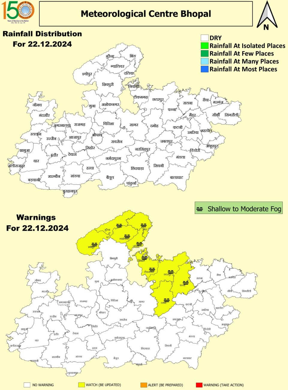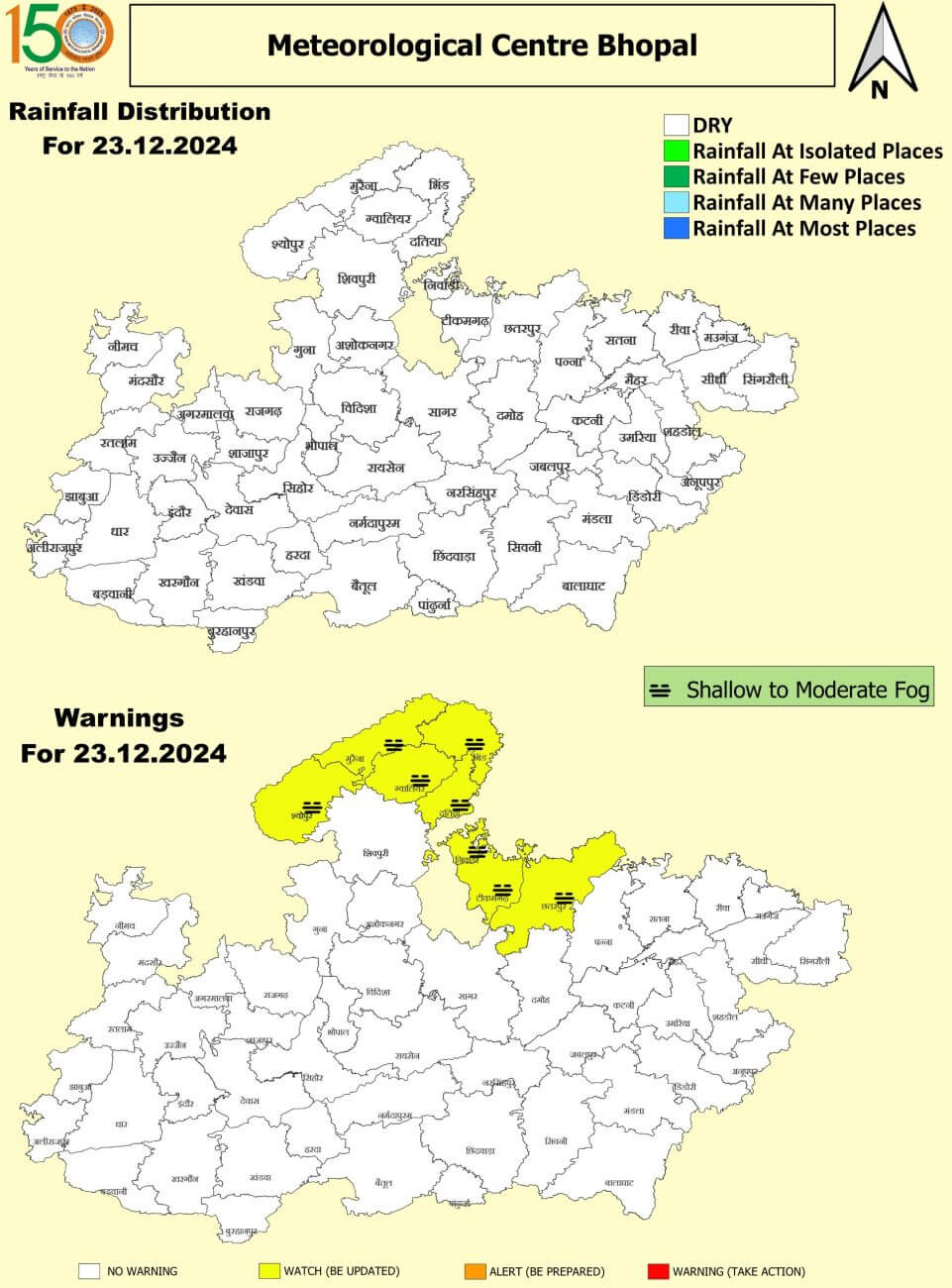 भोपाल, ग्वालियर, इंदौर, जबलपुर, उज्जैन, भिंड, दतिया, शिवपुरी, अशोकनगर, विदिशा, सीहोर, रायसेन, नरसिंहपुर, नर्मदापुरम, हरदा, बैतूल, खंडवा, बुरहानपुर, अलीराजपुर, सागर, नरसिंहपुर, दमोह, पन्ना, छतरपुर, टीकमगढ़, डिंडौरी, अनूपपुर, शहडोल, उमरिया, मैहर, सतना और निवाड़ी में कहीं-कहीं बारिश हो सकती है।27 दिसंबर को एक प्रभावी पश्चिमी विक्षोभ के उत्तर भारत में पहुंचने से भी 28 दिसंबर को बादल छा सकते हैं और कहीं कहीं हल्की बारिश हो सकती है।