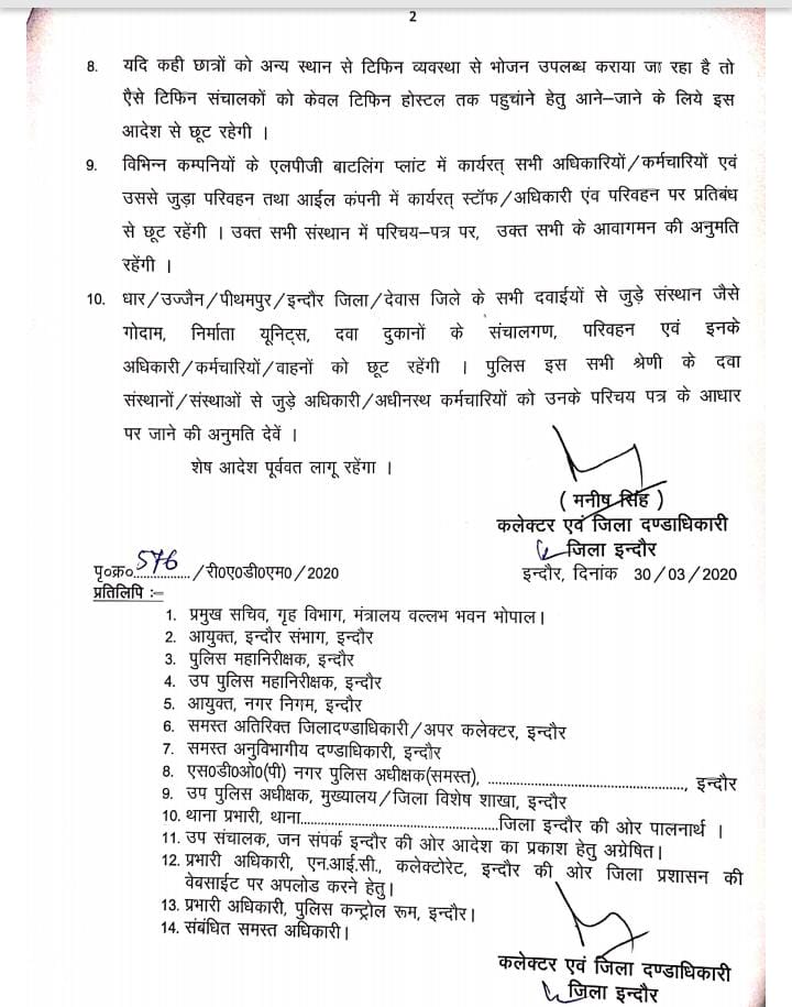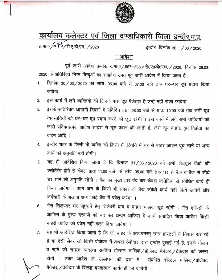 इंदौर। आकाश धौलपुरे। कोरोना वायरस को लेकर इंदौर प्रशासन अलर्ट पर है ऐसे में समाज के अलग – अलग वर्गों से उठी आवाज के बाद इंदौर में दूध बांटने के लिए जिला प्रशासन ने शाम 5 बजे से 7 बजे और सुबह 6 बजे से 9 बजे तक दूध दुकानों और फेरी वालो को दूध बाटने की छूट दी थी लेकिन प्रशासन का निर्णय उस समय गलत साबित हो गया जब दूध लेने के लिए शाम 5 बजे से लंबी लंबी कतार बगैर किसी सोशल डिस्टेंसिंग के पालन किये लग गईं। ऐसे में जिला कलेक्टर मनीष सिंह ने लॉक डाउन के दौरान दूध के लिए दुकानों पर लगी भीड़ को देखकर नया आदेश जारी कर दिया जिसके तहत अब सुबह 8 बजे से 10 बजे और शाम 5 बजे से 7 बजे के बीच दूध की बंदी और पैकेट्स वाले विक्रेता घर – घर जाकर दूध का वितरण करेंगे और कोई भी व्यक्ति घर से दुकान के लिए दूध लेने नही निकलेगा क्योंकि दुकान पूरी तरह से बंद रहेगी। वही प्रशासन ने आज बदइंतजामी को देखते हुए बैंकों की क्लोज़िंग के लिए बैंक कर्मियों के लिए 11 से 5 बजे का समय निर्धारित किया है। बैंककर्मी इस दौरान बैंक का मुख्य द्वार बंद कर क्लोज़िंग का काम करेंगे। इस दौरान उन्हें घर से सीधे बैंक और बैंक से सीधे घर जाने की अनुमति होगी। इसके अलावा गैस एजेंसी भी अपनी दुकान का शटर बन्द कर गैस सिलेंडर घर घर तक पहुंचाने का काम करेगी। आम जनता न तो बैंक और ना ही गैस एजेंसी के दफ्तर जा सकेंगे।इधर, जिला कलेक्टर के नए आदेश के मुताबिक प्रोजेक्ट मैनेजर, ठेकेदार और होस्टल संचालक बाहर के मजदूरों और स्टूडेंट्स के खाने की व्यवस्था स्वयं करेंगे और आदेश उल्लंघन पर उन पर कार्रवाई की जाएगी। इसके अलावा छात्रों और अन्य लोगो के टिफिन संचालक टिफिन लेकर नियमो का पालन कर आ जा सकेंगे। वही एलपीजी बॉटलिंग प्लांट आईल कम्पनी के साथ ही देवास, धार, उज्जैन, इंदौर, पीथमपुर में दवाई कार्य से जुड़े कर्मचारी व अधिकारी परिचय पत्र के आधार पर आ जा सकेंगे। कुल मिलाकर इंदौर में दूध की लगी भीड़ ने टोटल लॉक डाउन में मुश्किले खड़ी कर दी है जिसके चलते बंदी का दूध और दूध पैकेट वाले अब सुबह 8 बजे से 10 और शाम 5 बजे से 7 बजे के बीच घर पहुंच सेवा करेंगे। वही दूध के लिए लगी भीड़ के बाद प्रशासन ने आखिरकार अन्य सेक्टर्स के लिए भी नियम जारी कर दिए है वही आम आदमी के लिए प्रशासन का अभी भी एक ही नियम है कि वो घर पर रहे और खुद को महफूज रखे।