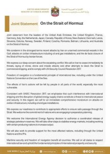 खाड़ी क्षेत्र में बढ़ते तनाव और होर्मुज स्ट्रेट में नौवहन की स्वतंत्रता पर मंडराते खतरे को लेकर दुनिया के 22 देशों ने एकजुट होकर ईरान के खिलाफ कड़ा रुख अपनाया है। संयुक्त अरब अमीरात (UAE) की अगुवाई में इन देशों ने एक साझा बयान जारी किया है, जिसमें ईरान द्वारा हाल ही में किए गए हमलों की पुरजोर निंदा की गई है।