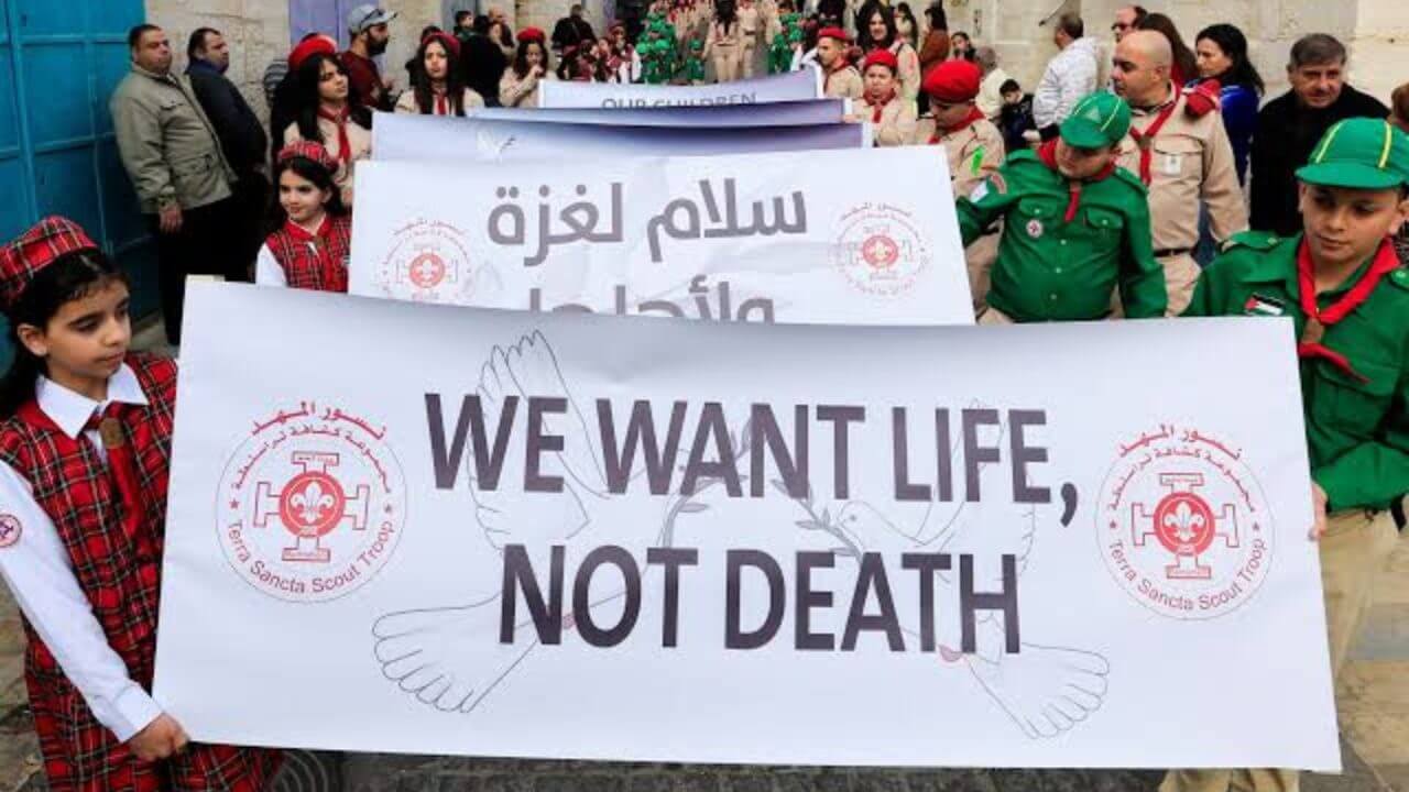क्रिसमस ईव पर फिलिस्तीनी स्काउट्स ने सड़कों पर एक शांति मार्च निकाला, जो उनके पारंपरिक जोशीले और संगीत से गूंजने वाले ब्रास बैंड से बिल्कुल अलग था। मार्च में शामिल कुछ लोगों ने हाथों में तख्तियां थाम रखी थीं जिनपर लिखा था “हमें जीवन चाहिए, मृत्यु नहीं।” इस बीच, सुरक्षा बलों ने चर्च ऑफ द नैटिविटी के आस-पास कड़ी चौकसी रखते हुए अवरोध लगाए। यह वही स्थान है, जिसे यीशु के जन्मस्थल के ऊपर बनाया गया माना जाता है।