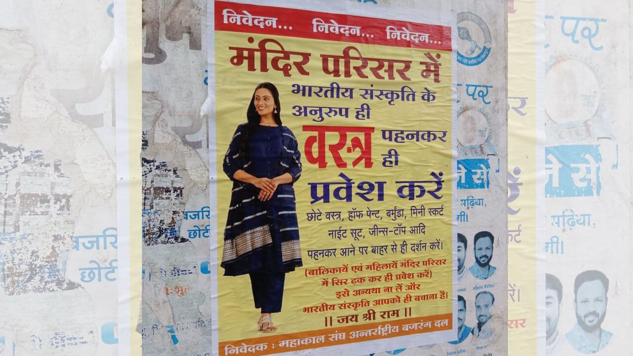 महाकाल संघ अंतराष्ट्रीय बजरंग दल के कार्यकर्ताओं ने निवेदन करते हुए पोस्टरों में लिखा है कि मंदिर परिसर में भारतीय संस्कृति के अनुरुप ही वस्त्र पहनकर ही प्रवेश करें, छोटे वस्त्र हाॅफ पेंट, बर्मुडा, मिनी स्कर्ट, नाइट सूट, जींस-टाॅप आदि पहनकर आने पर मंदिर के बाहर ही दर्शन करने होंगे। बालिकाएं एवं महिलाएं मंदिर परिसर में सिर ढककर ही प्रवेश करें। इसे अन्यथा ना लें, भारतीय संस्कृति आपको ही बचाना है।