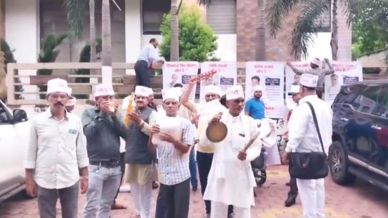 BJP ऑफिस पर ग्रामीणों ने बजाये शंख, मंजीरे, घंटे