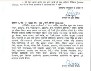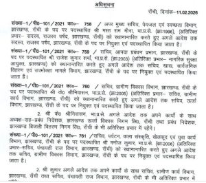 झारखंड में बड़ा प्रशासनिक फेरबदल किया गया है। राज्य की हेमंत सोरेन सरकार ने बुधवार (11 फरवरी 2026) की देर रात 16 आईएएस अधिकारियों के तबादले किए हैं। इसमें आईएएस अधिकारियों को विभिन्न विभागों में सचिव, अपर सचिव या प्रमंडलीय आयुक्त जैसे पदों पर तैनात किया गया है। दो अधिकारियों को अतिरिक्त प्रभार भी सौंपा गया है। कार्मिक, प्रशासनिक सुधार तथा राजभाषा विभाग द्वारा इसकी आधिकारिक अधिसूचना जारी कर दी गई है। सभी अधिकारियों को जल्द से जल्द अधिसूचित जगह पर योगदान देने का निर्देश दिया गया है।