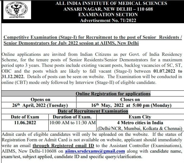 परीक्षा देश के 4 मेट्रो शहरों मुंबई, कोलकाता, दिल्ली और चेन्नई में आयोजित होगी। एम्स दिल्ली में जारी की गई भर्ती के लिए परीक्षा का आयोजन 11 जून, 2022 को किया जाएगा।मोटे तौर पर संबंधित विषय में एमडी/एमएस/डीएनबी किए कैंडिडेट अप्लाई कर सकते हैं