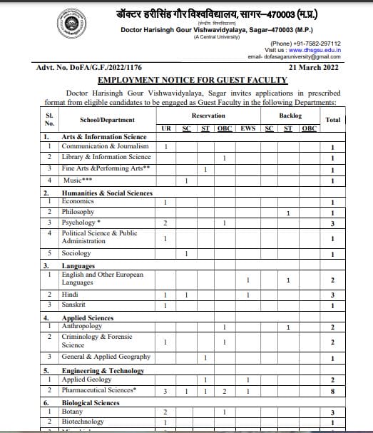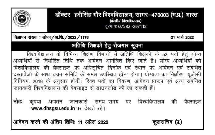 भोपाल, डेस्क रिपोर्ट।MP Job Alert 2022. मध्य प्रदेश में अतिथि विद्वानों के लिए नौकरी पाने का सुनहरा अवसर है। सागर की डॉ हरिसिंह गौर विश्वविद्यालय ( DHSGSU- Dr. Harisingh Gour University ) ने गेस्ट फैकल्टी के 52 पदों पर भर्ती निकाली है। इसके लिए आवेदन की प्रक्रिया शुरू हो चुकी है और लास्ट डेट 11 अप्रैल 2022 है।इसमें चयनित उम्मीदवार को 1500 प्रति लेक्चर और 50,000 रुपए महिना दिया जाएगा।अधिक जानकारी के लिए dhsgsu.edu.in पर विजिट कर सकते है। उम्मीदवारों को सलाह दी जाती है कि जानकारी अच्छी से पड़ने के बाद ही आवेदन करें।