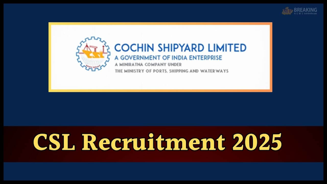 कोचीन शिपयार्ड लिमिटेड ने अप्रेंटिस पदों पर भर्ती (CSL Recruitment 2025) निकाली है। जिसके लिए आवेदन प्रक्रिया शुरू हो चुकी है। योग्य और इच्छुक उम्मीदवार 15 नवंबर 2025 तक ऑनलाइन आधिकारिक वेबसाइट www.cochinshipyard.in पर जाकर आवेदन कर सकते हैं। इससे पहले सभी कैंडिडेट्स को नोटिफिकेशन पढ़ने की सलाह दी जाती है। ताकि पात्रता, चयन प्रक्रिया, वेतन और अन्य जानकारी को लेकर किसी प्रकार की गड़बड़ी न हो।