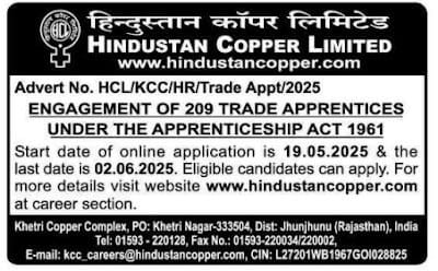 योग्य उम्मीदवार एचसीएल की ऑफिशियल वेबसाइट hindustancopper.com पर जाकर 2 जून तक आवेदन कर सकते हैं।इस भर्ती के माध्यम से 209 पदों को भरा जाएगा।