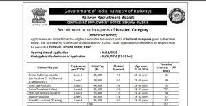 युवाओं के लिए रेलवे में नौकरी पाने का सुनहरा मौका है। रेलवे रिक्रूटमेंट बोर्ड (RRB Recruitment) ने आइसोलेटेड कैटेगरी के विभिन्न 311 पदों पर भर्ती के लिए आधिकारिक शॉर्ट नोटिफिकेशन जारी किया है। ऑनलाइन आवेदन की प्रक्रिया 30 दिसंबर, 2025 से शुरू होगी । आवेदन करने की अंतिम तिथि 29 जनवरी, 2026 निर्धारित की गई है। योग्य और इच्छुक उम्मीदवार आधिकारिक वेबसाइट rrbapply.gov.in पर जाकर आवेदन विंडो सक्रिय होने के बाद तय अंतिम तिथि तक आवेदन कर सकते हैं।