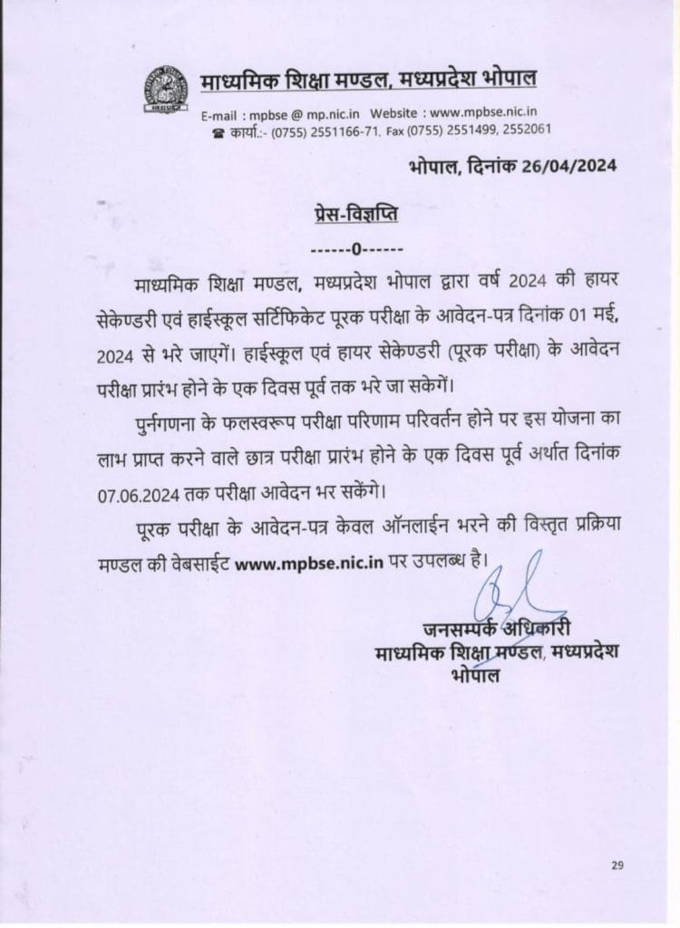 MP BOARD 10th-12th Supplementary Exam :मध्य प्रदेश माध्यमिक शिक्षा मंडल भोपाल द्वारा कक्षा 10वीं-12वीं के नतीजे जारी करने के बाद अब पूरक परीक्षा की समय सारणी जारी कर दी गई है। इसके तहत 1 मई से पूरक परीक्षा के फार्म भरे जाएंगे। छात्र मासिमं की वेबसाइट www.mpbse.nic.in पर जाकर ऑनलाइन फार्म भर सकते है। यह परीक्षाएं 9 जून 2024 को आयोजित की जाएगी।