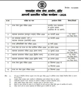 - MPPSC कैलेंडर के मुताबिक, 2026 की सबसे पहली परीक्षा सहायक प्राध्यापक (कंप्यूटर साइंस) 4 जनवरी 2026 को प्रस्तावित है।इसके अलावा कैलेंडर में राज्य इंजीनियरिंग सेवा परीक्षा 2025, राज्य सेवा एवं राज्य वन सेवा प्रारंभिक परीक्षा 2026, टेक्निकल, असिस्टेंट प्रोफेसर, असिस्टेंट डायरेक्टर, डिप्टी डायरेक्टर, प्रिंसिपल (क्लास-II), डेंटल सर्जन, माइनिंग ऑफिसर और राज्य इंजीनियरिंग सेवा जैसे पदों के लिए परीक्षाओं की तारीख भी घोषित की गई हैं।